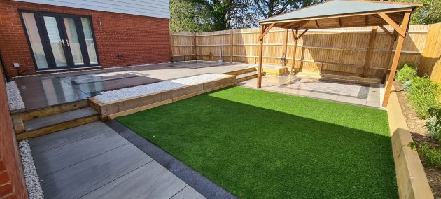 Brief Our Client required a full garden design to incorporate there existing deck, a new sitting area in an unused area of the garden with an artificial lawn and the possibility of a self contained Water feature Project Condition Garden was mainly laid to lawn with an existing Softwood Deck, The rear of the garden…