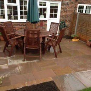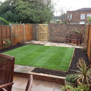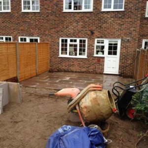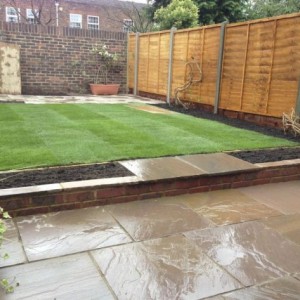 New patio and lawn with borders to allow for new planting areas.